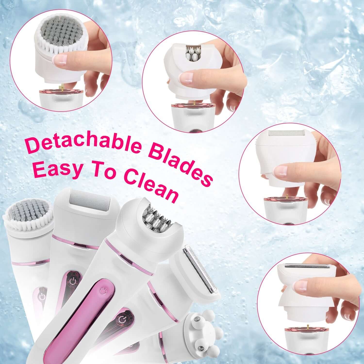 - *IPX7 Waterproof for Wet & Dry Use*: This women's electric razor can be used in foam or dry,bath or shower. The 5 detachable heads are completely waterproof. Easy to clean. Just pull out the head,use the brush to remove the hair,and then rinse the trimming head under running water. Note:The main body is not waterproof and don’t immerse it in water.